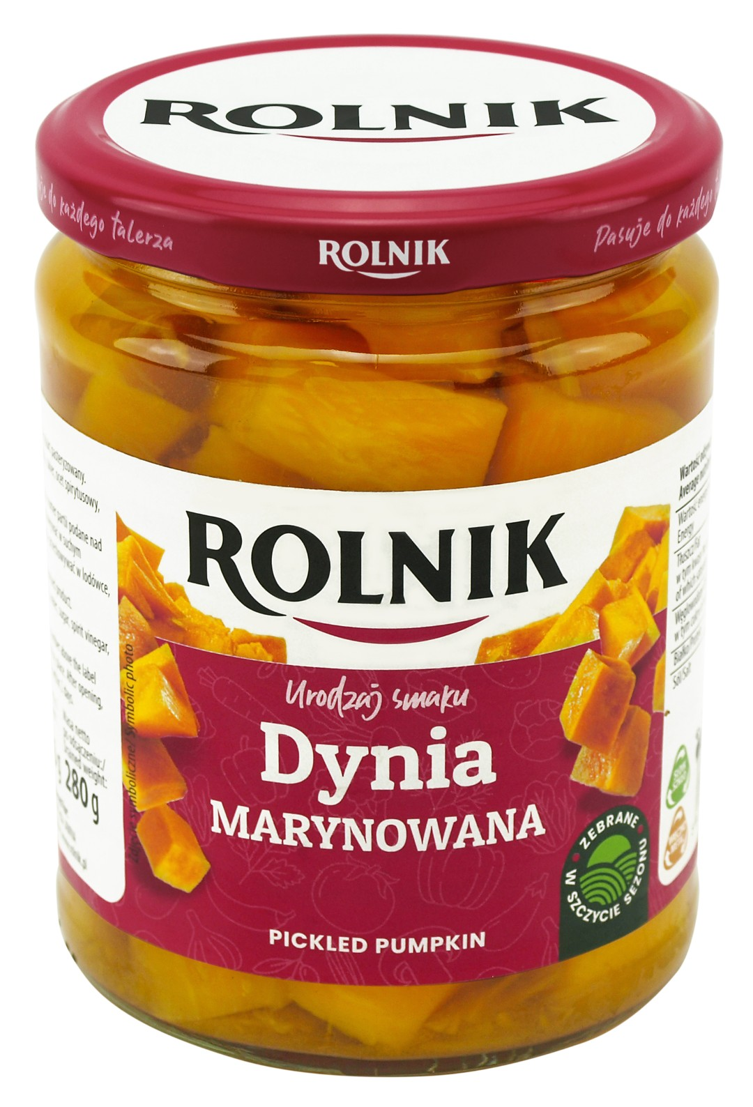 Dynia marynowana Rolnik - warzywo, królujące w polskich kuchniach głównie jesienią, pozwoli Ci cieszyć się swoim słodko-kwaśnym smakiem niezależnie od pory roku. Każdy słoik skrywa elegancko pokrojoną, dojrzałą dynię, zanurzoną w delikatnej, octowej zalewie. Dynia konserwowa jest wyśmienitym dodatkiem do mięs, podawanych na ciepło i zimno. Idealnie harmonizuje z piersią z kurczaka i schabem. To także pyszna i zdrowa przekąska.