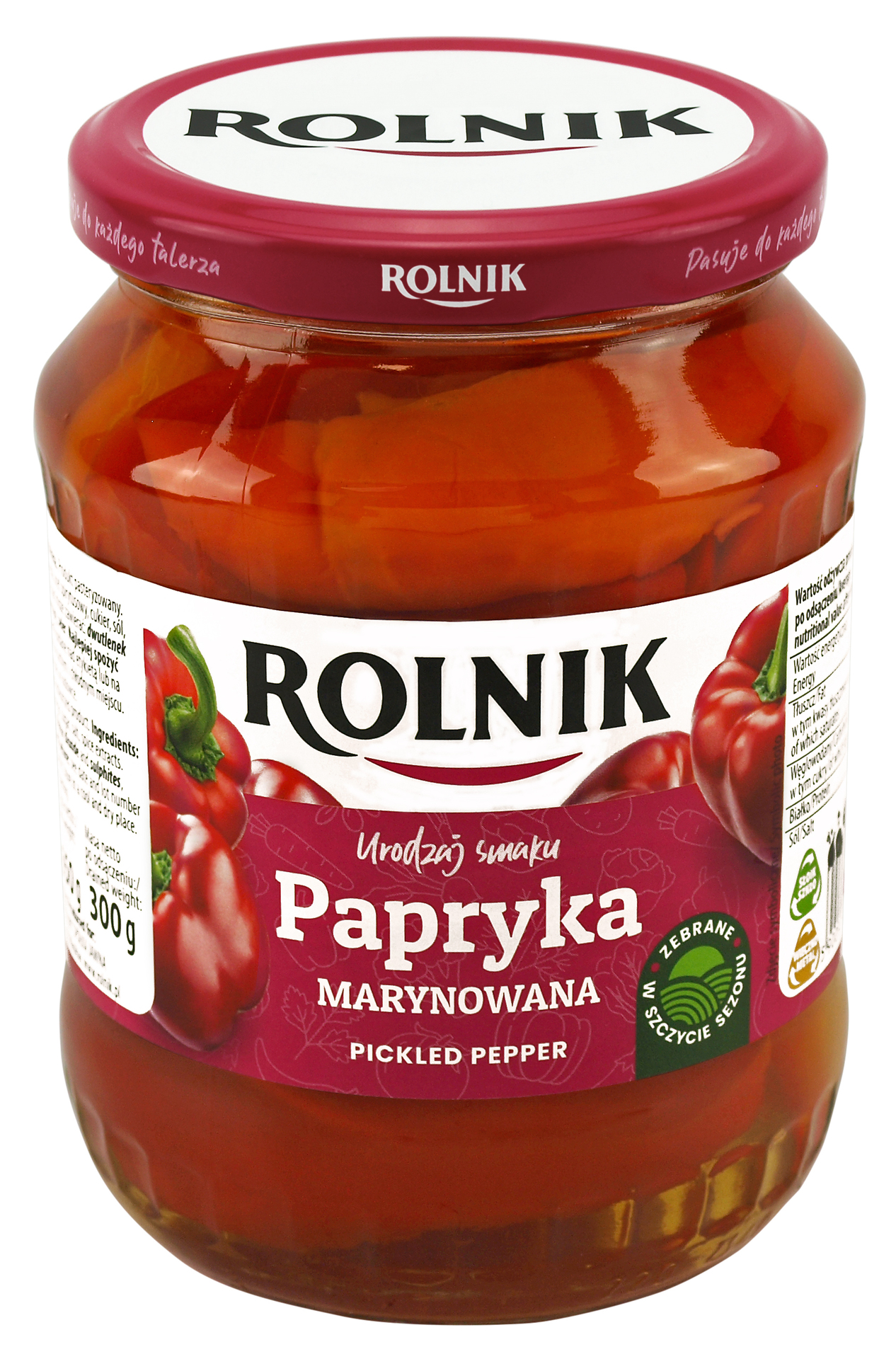Papryka marynowana Rolnik, to połączenie soczystej, czerwonej papryki oraz tradycyjnej, octowej marynaty, pełnej aromatycznych przypraw. Marynowana papryka jest jednym z ulubionych przetworów kuchni polskiej, ze względu na swój charakterystyczny, słodko-kwaśny smak i wszechstronność zastosowań. Stanowi wyrazisty, warzywny dodatek do mięs, ryb i leczo. Doskonale pasuje do sałatek, koreczków i talerza przekąsek.